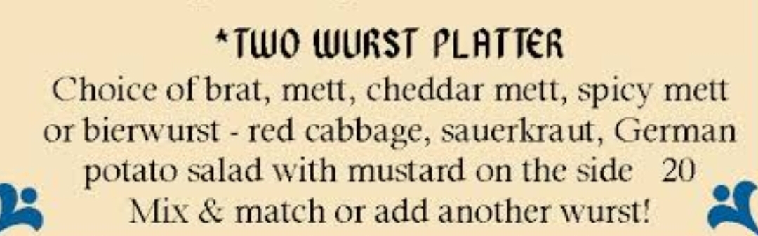 Choice of brat, mett, cheddar mett, spicy mett or bierwurst - red cabbage, sauerkraut, potato salad w/ mustard on the side. Mix & match or add another wurst!